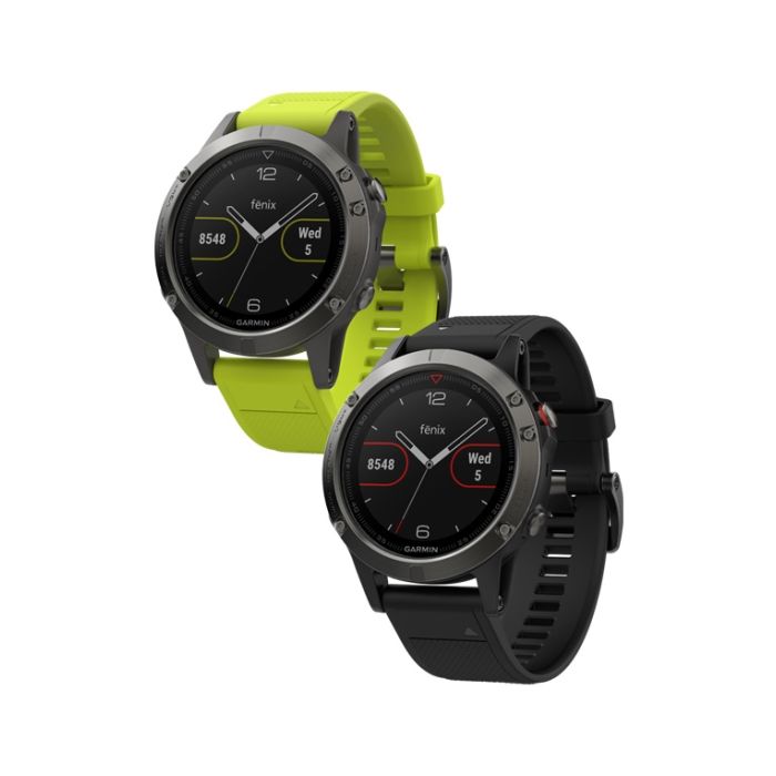 Garmin Fenix 5 fås i Slate Grey med neongul rem eller Slategrey med sort rem. Uret findes også i en Sapphire version der kan findes HER